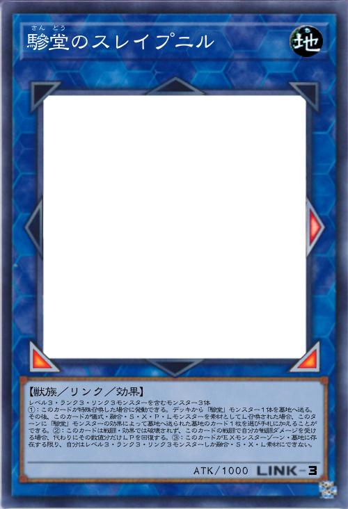 | レベル3・ランク3・リンク3モンスターを含むモンスター3体 ①:このカードが特殊召喚した場合に発動できる。デッキから「驂堂」モンスター1体を墓地へ送る。その後、このカードが儀式・融合・S・X・P・Lモンスターを素材としてL召喚された場合、このターンに「驂堂」モンスターの効果によって墓地へ送られた墓地のカード1枚を選び手札に加えることができる。②:このカードは戦闘・効果では破壊されず、このカードの戦闘で自分が戦闘ダメージを受ける場合、代わりにその数値分だけLPを回復する。③:このカードがEXモンスターゾーン・墓地に存在する限り、自分はレベル3・ランク3・リンク3モンスターしか融合・S・X・L素材にできない。 | |||