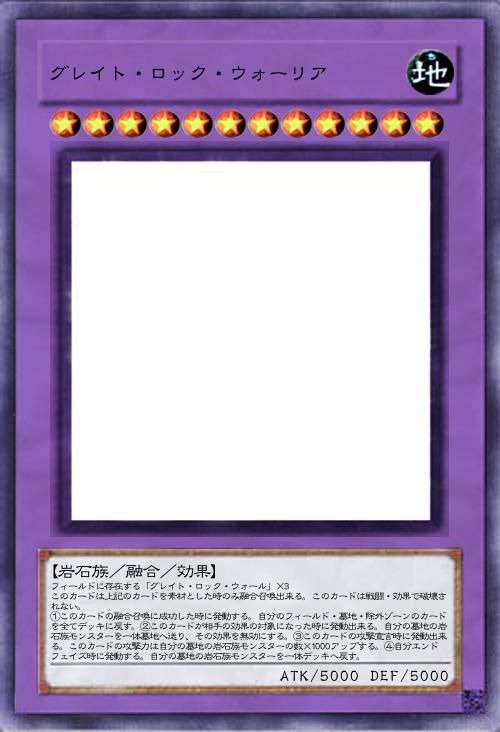 | フィールドに存在する「グレイト・ロック・ウォール」×3 このカードは上記のカードを素材とした時のみ融合召喚出来る。このカードは戦闘・効果で破壊されない。 ①このカードの融合召喚に成功した時に発動する。自分のフィールド・墓地・除外ゾーンのカードを全てデッキに戻す。②このカードが相手の効果の対象になった時に発動出来る。自分の墓地の岩石族モンスターを一体墓地へ送り、その効果を無効にする。③このカードの攻撃宣言時に発動出来る。このカードの攻撃力は自分の墓地の岩石族モンスターの数×1000アップする。④自分エンドフェイズ時に発動する。自分の墓地の岩石族モンスターを一体デッキへ戻す。 | |||