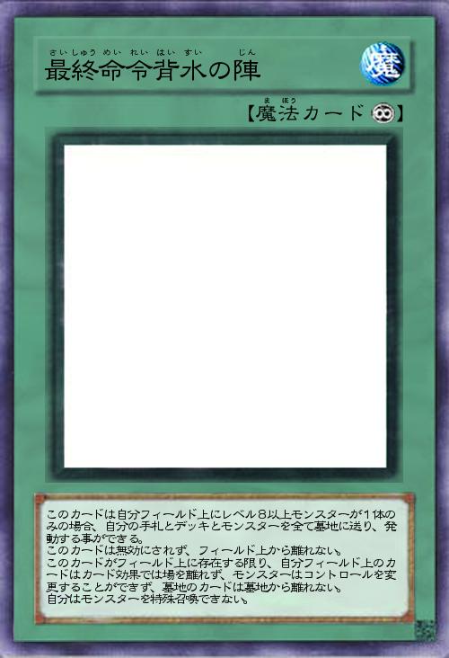 このカードは自分フィールド上にレベル8以上モンスターが1体のみの場合、自分の手札とデッキとモンスターを全て墓地に送り、発動する事ができる。 このカードは無効にされず、フィールド上から離れない。 このカードがフィールド上に存在する限り、自分フィールド上のカードはカード効果では場を離れず、モンスターはコントロールを変更することができず、墓地のカードは墓地から離れない。 自分はモンスターを特殊召喚できない。 |