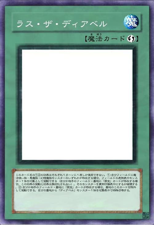 | このカード名の①②の効果はそれぞれ1ターンに1度しか使用できない。①:自分フィールドに魔法使い族・悪魔族・幻想魔族モンスターのいずれかが存在する場合、フィールドの表側表示モンスター1体を対象として発動できる(自分か相手のフィールド・墓地に「罪宝」カードが存在する場合、この効果の発動と効果は無効化されない)。そのモンスターを裏側守備表示にするか破壊する。②:自分か相手のフィールド・墓地に「罪宝」カードが存在する場合、墓地のこのカードを除外して発動できる。自分の墓地から「ディアベル」モンスター1体を攻撃表示で特殊召喚する。 | |||