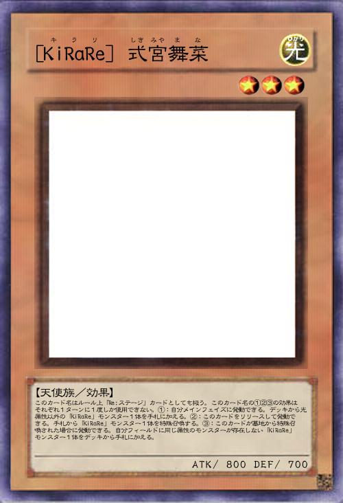 | このカード名はルール上「Re:ステージ」カードとしても扱う。このカード名の①②③の効果はそれぞれ1ターンに1度しか使用できない。①:自分メインフェイズに発動できる。デッキから光属性以外の「KiRaRe」モンスター1体を手札に加える。②:このカードをリリースして発動できる。手札から「KiRaRe」モンスター1体を特殊召喚する。③:このカードが墓地から特殊召喚された場合に発動できる。自分フィールドに同じ属性のモンスターが存在しない「KiRaRe」モンスター1体をデッキから手札に加える。 | |||