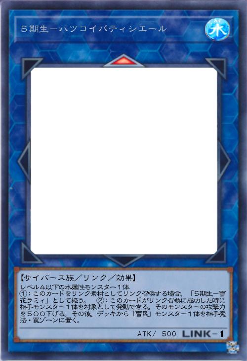 | レベル4以下の水属性モンスター1体 ①:このカードをリンク素材としてリンク召喚する場合、「5期生-雪花ラミィ」として扱う。 ②:このカードがリンク召喚に成功した時に相手モンスター1体を対象として発動できる。そのモンスターの攻撃力を500下げる。その後、デッキから「雪民」モンスター1体を相手魔法・罠ゾーンに置く。 | |||