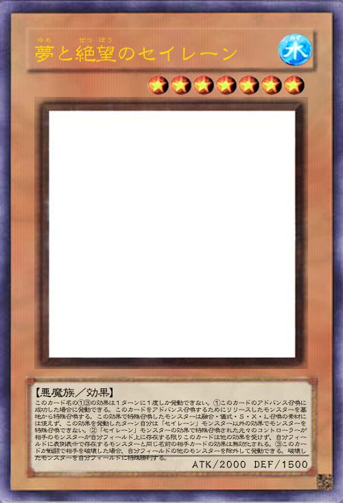 | このカード名の①③の効果は1ターンに1度しか発動できない。①このカードのアドバンス召喚に成功した場合に発動できる。このカードをアドバンス召喚するためにリリースしたモンスターを墓地から特殊召喚する。この効果で特殊召喚したモンスターは融合・儀式・S・X・L召喚の素材には使えず、この効果を発動したターン自分は「セイレーン」モンスター以外の効果でモンスターを特殊召喚できない。②「セイレーン」モンスターの効果で特殊召喚された元々のコントローラーが相手のモンスターが自分フィールド上に存在する限りこのカードは他の効果を受けず、自分フィールドに表側表示で存在するモンスターと同じ名前の相手カードの効果は無効化される。③このカードが戦闘で相手を破壊した場合、自分フィールドの他のモンスターを除外して発動できる。破壊したモンスターを自分フィールドに特殊勝利する。 | |||