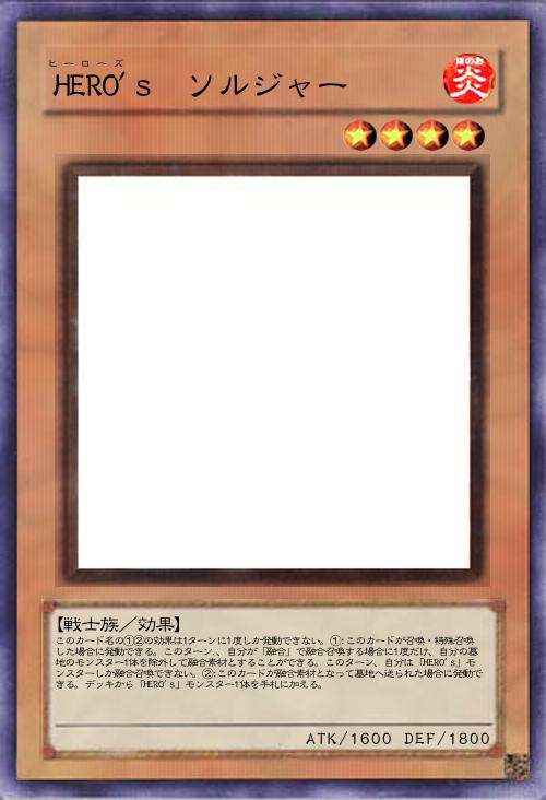 | このカード名の①②の効果は1ターンに1度しか発動できない。①:このカードが召喚・特殊召喚した場合に発動できる。このターン.、自分が「融合」で融合召喚する場合に1度だけ、自分の墓地のモンスター1体を除外して融合素材とすることができる。このターン、自分は「HERO's」モンスターしか融合召喚できない。②:このカードが融合素材となって墓地へ送られた場合に発動できる。デッキから「HERO's」モンスター1体を手札に加える。 | |||