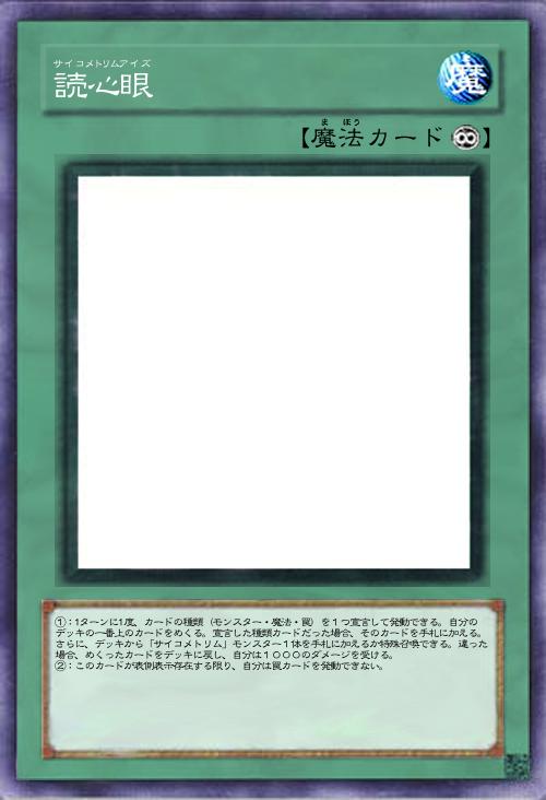 | ①:1ターンに1度、カードの種類(モンスター・魔法・罠)を1つ宣言して発動できる。自分のデッキの一番上のカードをめくる。宣言した種類カードだった場合、そのカードを手札に加える。さらに、デッキから「サイコメトリム」モンスター1体を手札に加えるか特殊召喚できる。違った場合、めくったカードをデッキに戻し、自分は1000のダメージを受ける。 ②:このカードが表側表示存在する限り、自分は罠カードを発動できない。 | |||