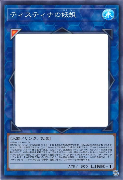 | 水族モンスター1体 自分は「ティスティナの妖蛆」を1ターンに1度しか特殊召喚できず、その②③の効果はそれぞれ1ターンに1度しか使用できない。①:このカードがL召喚した場合に発動できる。デッキからレベル4以下の水族モンスター1体を墓地へ送る。このターン、光属性の「ティスティナ」モンスターの効果の発動に対して、相手は効果を発動できない。②:自分フィールド・墓地に水族モンスター以外のモンスターが存在しない場合、手札を1枚捨てて発動できる。手札・デッキからレベル4以下の「ティスティナ」モンスター1体を特殊召喚する。③:このカードが墓地に存在し、自分フィールドに光属性の「ティスティナ」モンスターが存在する場合に発動できる。このカードを特殊召喚する。 | |||