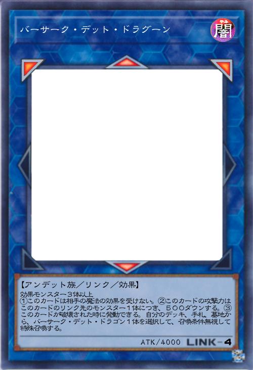 | 効果モンスター3体以上 ①このカードは相手の魔法の効果を受けない。②このカードの攻撃力はこのカードのリンク先のモンスター1体につき、500ダウンする。③このカードが破壊された時に発動できる。自分のデッキ、手札、墓地から、バーサーク・デット・ドラゴン1体を選択して、召喚条件無視して特殊召喚する。 | |||