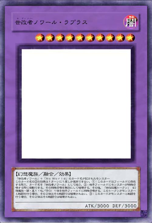 | 「世改者ノワール」+「No World」のカード名が記されたモンスター このカード名の②の効果は1ターンに1度しか使用できない。①:このカードはフィールドに存在する限り、カード名を「世改者ノワール」として扱う。②:相手フィールドにモンスターが特殊召喚する際に発動できる。その特殊召喚を無効にして破壊する。その後、「世改従魔トークン」(幻想魔族・闇・星1・攻/守0)1体を相手フィールドに特殊召喚する。このトークンがモンスターと戦闘を行う場合、その2体はその戦闘では破壊されない。③:このカードがモンスターと戦闘を行う場合、その2体はその戦闘では破壊されない。 | |||