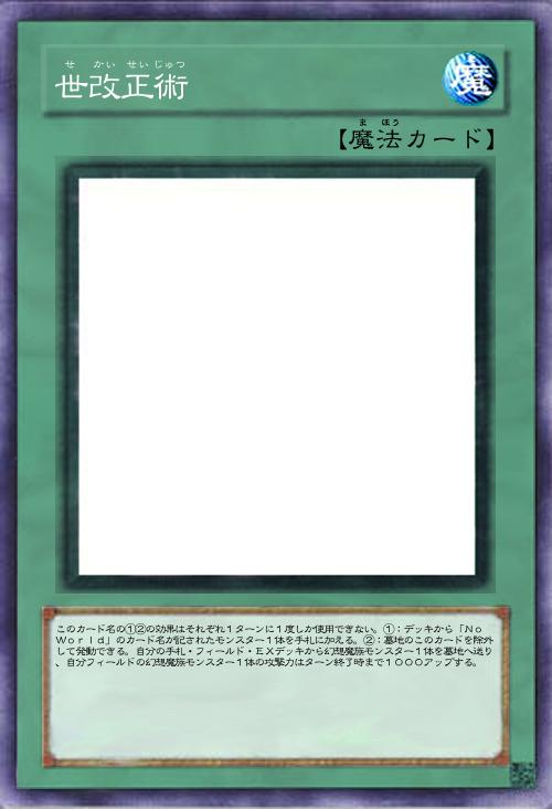 | このカード名の①②の効果はそれぞれ1ターンに1度しか使用できない。①:デッキから「No World」のカード名が記されたモンスター1体を手札に加える。②:墓地のこのカードを除外して発動できる。自分の手札・フィールド・EXデッキから幻想魔族モンスター1体を墓地へ送り、自分フィールドの幻想魔族モンスター1体の攻撃力はターン終了時まで1000アップする。 | |||