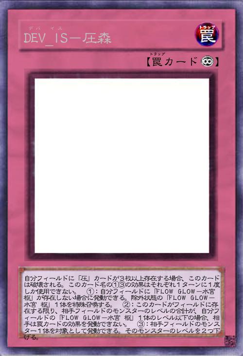 | 自分フィールドに「圧」カードが3枚以上存在する場合、このカードは破壊される。このカード名の①③の効果はそれぞれ1ターンに1度しか使用できない。 ①:自分フィールドに「FLOW GLOW-水宮 枢」が存在しない場合に発動できる。除外状態の「FLOW GLOW-水宮 枢」1体を特殊召喚する。 ②:このカードがフィールドに存在する限り、相手フィールドのモンスターのレベルの合計が、自分フィールドの「FLOW GLOW-水宮 枢」1体のレベル以下の場合、相手は罠カードの効果を発動できない。 ③:相手フィールドのモンスター1体を対象として発動できる。そのモンスターのレベルを2つ下げる。 | |||