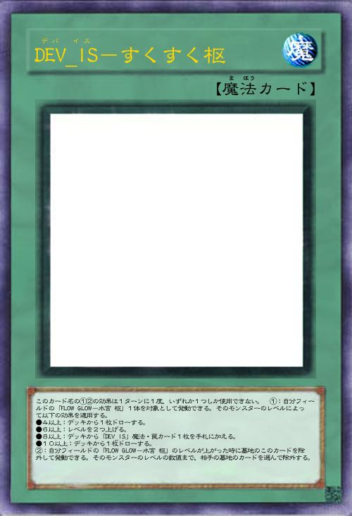 | このカード名の①②の効果は1ターンに1度、いずれか1つしか使用できない。 ①:自分フィールドの「FLOW GLOW-水宮 枢」1体を対象として発動できる。そのモンスターのレベルによって以下の効果を適用する。 ●4以上:デッキから1枚ドローする。 ●6以上:レベルを2つ上げる。 ●8以上:デッキから「DEV_IS」魔法・罠カード1枚を手札に加える。 ●10以上:デッキから1枚ドローする。 ②:自分フィールドの「FLOW GLOW-水宮 枢」のレベルが上がった時に墓地のこのカードを除外して発動できる。そのモンスターのレベルの数値まで、相手の墓地のカードを選んで除外する。 | |||