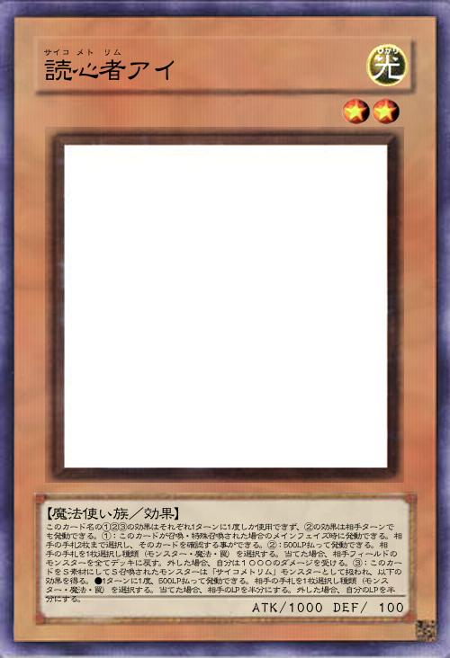 | このカード名の①②③の効果はそれぞれ1ターンに1度しか使用できず、②の効果は相手ターンでも発動できる。①:このカードが召喚・特殊召喚された場合のメインフェイズ時に発動できる。相手の手札2枚まで選択し、そのカードを確認する事ができる。②:500LP払って発動できる。相手の手札を1枚選択し種類(モンスター・魔法・罠)を選択する。当てた場合、相手フィールドのモンスターを全てデッキに戻す。外した場合、自分は1000のダメージを受ける。③:このカードをS素材にしてS召喚されたモンスターは「サイコメトリム」モンスターとして扱われ、以下の効果を得る。●1ターンに1度、500LP払って発動できる。相手の手札を1枚選択し種類(モンスター・魔法・罠)を選択する。当てた場合、相手のLPを半分にする。外した場合、自分のLPを半分にする。 | |||