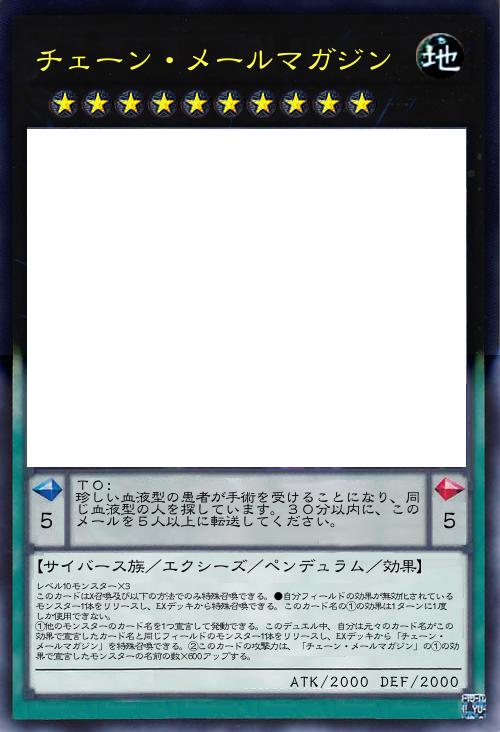 | レベル10モンスター×3 このカードはX召喚及び以下の方法でのみ特殊召喚できる。●自分フィールドの効果が無効化されているモンスター1体をリリースし、EXデッキから特殊召喚できる。このカード名の①の効果は1ターンに1度しか使用できない。 ①他のモンスターのカード名を1つ宣言して発動できる。このデュエル中、自分は元々のカード名がこの効果で宣言したカード名と同じフィールドのモンスター1体をリリースし、EXデッキから「チェーン・メールマガジン」を特殊召喚できる。②このカードの攻撃力は、「チェーン・メールマガジン」の①の効果で宣言したモンスターの名前の数×600アップする。 | |||