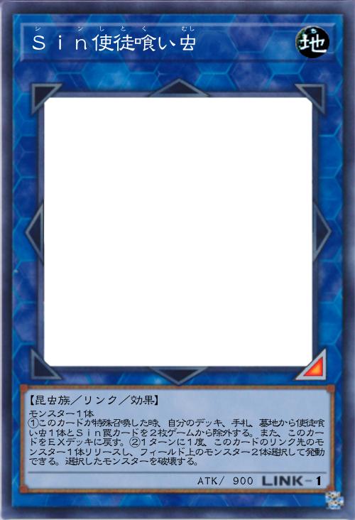| モンスター1体 ①このカードが特殊召喚した時、自分のデッキ、手札、墓地から使徒喰い虫1体とSin罠カードを2枚ゲームから除外する。また、このカードをEXデッキに戻す。②1ターンに1度、このカードのリンク先のモンスター1体リリースし、フィールド上のモンスター2体選択して発動できる。選択したモンスターを破壊する。 | |||