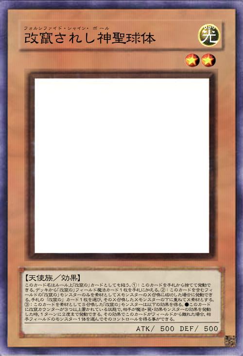 | このカード名はルール上「改竄の」カードとしても扱う。①:このカードを手札から捨てて発動できる。デッキから「改竄の」フィールド魔法カード1枚を手札に加える。②:このカードを含むフィールドの「改竄の」モンスターのみを素材としてXモンスターのX召喚に成功した場合に発動できる。手札の「改竄の」カード1枚を選び、そのX召喚したXモンスターの下に重ねてX素材とする。③:このカードを素材としてS召喚した「改竄の」モンスターは以下の効果を得る。●このカードに改竄カウンターが3つ以上置かれている状態で、相手が魔法・罠・効果モンスターの効果を発動した時、1ターンに2度まで発動できる。その効果でこのカードがフィールドから離れた場合、相手フィールドのモンスター1体を選んでそのコントロールを得る事ができる。 | |||