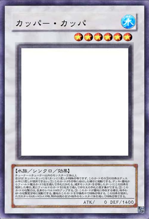| チューナー+チューナー以外のモンスター2体以上 自分は「カッパー・カッパ」を1ターンに1度しか特殊召喚できず、このカード名の③の効果はデュエル中に1度しか使用できない。①:このカードがS召喚に成功した場合に発動できる。デッキ・墓地からフィールド魔法カード1枚を選んで手札に加える。通常モンスターを召喚したターンにこの効果を使用した場合、更にフィールドのカードを2枚まで選んで持ち主の手札に戻す事ができる。②:このカードの攻撃力は、自身のレベル×400アップする。③:このカードが墓地に存在する場合、相手モンスターの攻撃宣言時に発動できる。墓地のこのカードを守備表示で特殊召喚する。この効果を使用した次のターンのスタンバイフェイズ時、除外状態の自分・相手のモンスター1体を選んで特殊召喚できる。 | |||
