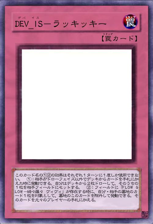 | このカード名の①②の効果はそれぞれ1ターンに1度しか使用できない。 ①:相手がドローフェイズ以外でデッキからカードを手札に加えた時に発動できる。自分はデッキから2枚ドローして、そのうちの1枚を相手フィールドにセットする。 ②:フィールドに「FLOW GLOW-綺々羅々 ヴィヴィ」が存在する時に、自分・相手の墓地のカード1枚を対象として、墓地のこのカードを除外して発動できる。そのカードを元々のプレイヤーの手札に加える。 | |||