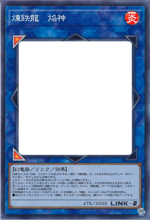 | 効果モンスター2体。このカードは自分の手札・場の「煉鉄龍」カード2枚を持ち主のデッキ・EXデッキに戻し、EXデッキから召喚できる。 このカード名の①②の効果は共に1ターンに1度しか発動できない。 ①このカードのリンク先にモンスターが2体いる場合に発動できる。その2体を持ち主の手札に戻す。 ②バトルフェイズ開始時に発動できる。デッキ・EXデッキから「煉鉄龍」カード1枚を選び、このカードに装備する(1枚のみ装備可能)。 ③特殊紹介したこのカード及びこのカードを装備した「煉鉄」モンスターは以下の効果を得る。 ●自分メインモンスターゾーンの「煉鉄」モンスターの攻撃力は、場のカードの数×100アップする。 | |||