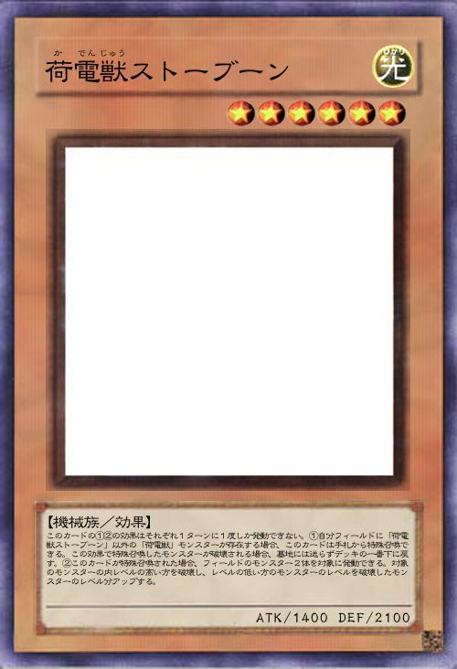 | このカードの①②の効果はそれぞれ1ターンに1度しか発動できない。①自分フィールドに「荷電獣ストーブーン」以外の「荷電獣」モンスターが存在する場合、このカードは手札から特殊召喚できる。この効果で特殊召喚したモンスターが破壊される場合、墓地には送らずデッキの一番下に戻す。②このカードが特殊召喚された場合、フィールドのモンスター2体を対象に発動できる。対象のモンスターの内レベルの高い方を破壊し、レベルの低い方のモンスターのレベルを破壊したモンスターのレベル分アップする。 | |||