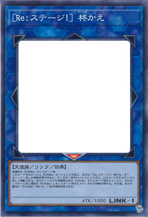 | 地属性の「KiRaRe」モンスター1体 このカード名はルール上「KiRaRe」カードとしても扱う。自分は「[Re:ステージ!] 柊かえ」を1ターンに1度しか特殊召喚できない。①:自分・相手のバトルフェイズに、このカードをEXデッキに戻して発動できる。自分フィールドの地属性以外の「KiRaRe」モンスター1体をリリースし、そのモンスターと同じ属性の「KiRaRe」Lモンスター1体をEXデッキから特殊召喚する。その後、自分の墓地の「[KiRaRe] 柊かえ」1体を特殊召喚できる。 | |||