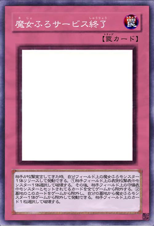 | 相手が攻撃宣言してきた時、自分フィールド上の魔女ふろモンスター1体リリースして発動できる。①相手フィールド上の表側攻撃表示モンスター1体選択して破壊する。その後、相手フィールド上の守備表示モンスターとセットされてるカードを全てゲームから除外する。②墓地のこのカードをゲームから除外し、自分の墓地から魔女ふろモンスター1体ゲームから除外して発動できる。相手フィールド上のカード1枚選択して破壊する。 | |||