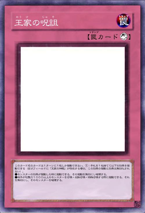 | このカード名のカードは1ターンに1枚しか発動できない。①:手札を1枚捨てて以下の効果を発動できる(自分フィールドに「王家の神殿」が存在する場合、この効果の発動と効果は無効化されない)。 ●モンスターの効果が発動した時に発動できる。その発動を無効にし破壊する。 ●相手が攻撃力1000以上のモンスターを召喚・反転召喚・特殊召喚する際に発動できる。それを無効にし、そのモンスターを破壊する。 | |||