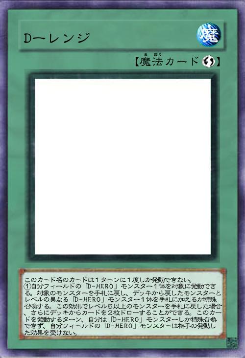 | このカード名のカードは1ターンに1度しか発動できない。 ①自分フィールドの「D-HERO」モンスター1体を対象に発動できる。対象のモンスターを手札に戻し、デッキから戻したモンスターとレベルの異なる「D-HERO」モンスター1体を手札に加えるか特殊召喚する。この効果でレベル5以上のモンスターを手札に戻した場合、さらにデッキからカードを2枚ドローすることができる。このカードを発動するターン、自分は「D-HERO」モンスターしか特殊召喚できず、自分フィールドの「D-HERO」モンスターは相手の発動した効果を受けない。 | |||