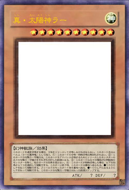 | このカードを通常召喚する場合、3体をリリースして召喚しなければならない。このカード名はルール上「ラーの翼神竜」として扱う。①:このカードの召喚・特殊召喚は無効化されない。②:このカードの攻撃力・守備力は、このカードをアドバンス召喚するためにリリースしたモンスターの元々の攻撃力・守備力をそれぞれ合計した数値になる。③:このカードは元々の種族が幻神獣族のモンスターを除く、他のカードの効果を受けない。④:このカードが特殊召喚した場合、以下の効果から1つを選択して発動できる。このターン終了時、このカードは墓地へ送られる。●1000LPを払って発動できる。フィールドのモンスター1体を墓地へ送る。●100LPになるようにLPを払って発動できる。このカードの攻撃力・守備力は払った数値分アップする。 | |||