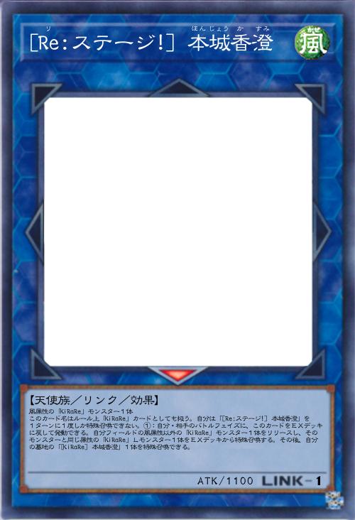 | 風属性の「KiRaRe」モンスター1体 このカード名はルール上「KiRaRe」カードとしても扱う。自分は「[Re:ステージ!] 本城香澄」を1ターンに1度しか特殊召喚できない。①:自分・相手のバトルフェイズに、このカードをEXデッキに戻して発動できる。自分フィールドの風属性以外の「KiRaRe」モンスター1体をリリースし、そのモンスターと同じ属性の「KiRaRe」Lモンスター1体をEXデッキから特殊召喚する。その後、自分の墓地の「[KiRaRe] 本城香澄」1体を特殊召喚できる。 | |||
