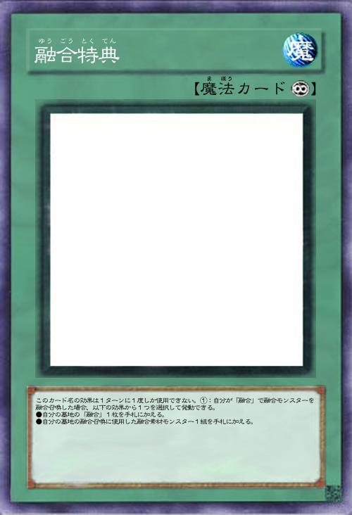 | このカード名の効果は1ターンに1度しか使用できない。①:自分が「融合」で融合モンスターを融合召喚した場合、以下の効果から1つを選択して発動できる。 ●自分の墓地の「融合」1枚を手札に加える。 ●自分の墓地の融合召喚に使用した融合素材モンスター1組を手札に加える。 | |||
