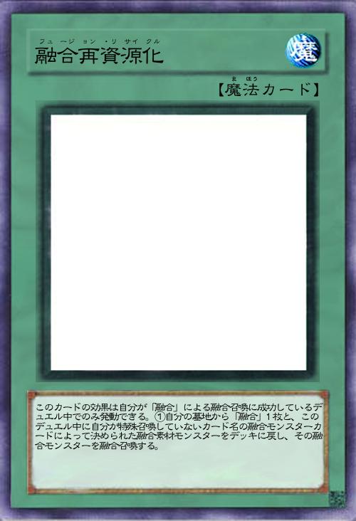 | このカードの効果は自分が「融合」による融合召喚に成功しているデュエル中でのみ発動できる。①自分の墓地から「融合」1枚と、このデュエル中に自分が特殊召喚していないカード名の融合モンスターカードによって決められた融合素材モンスターをデッキに戻し、その融合モンスターを融合召喚する。 | |||