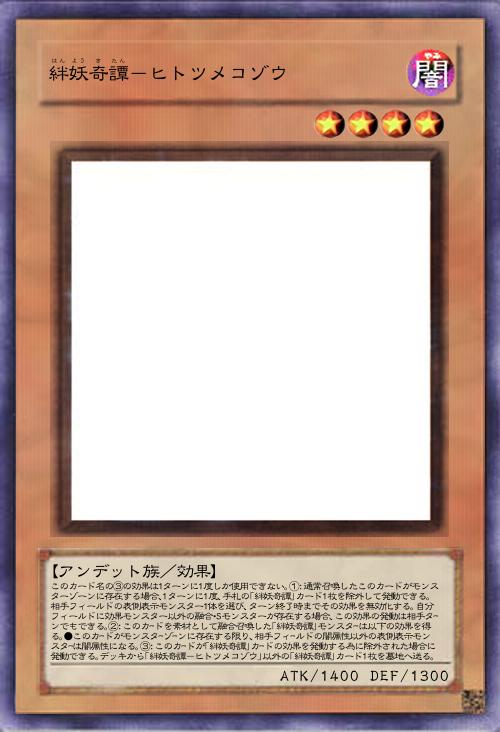 | このカード名の③の効果は1ターンに1度しか使用できない。①:通常召喚したこのカードがモンスターゾーンに存在する場合、1ターンに1度、手札の「絆妖奇譚」カード1枚を除外して発動できる。相手フィールドの表側表示モンスター1体を選び、ターン終了時までその効果を無効化する。自分フィールドに効果モンスター以外の融合・Sモンスターが存在する場合、この効果の発動は相手ターンでもできる。②:このカードを素材として融合召喚した「絆妖奇譚」モンスターは以下の効果を得る。●このカードがモンスターゾーンに存在する限り、相手フィールドの闇属性以外の表側表示モンスターは闇属性になる。③:このカードが「絆妖奇譚」カードの効果を発動する為に除外された場合に発動できる。デッキから「絆妖奇譚-ヒトツメコゾウ」以外の「絆妖奇譚」カード1枚を墓地へ送る。 | |||