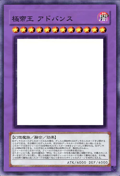 | EXデッキのカードがこのカードのみの場合、デュエル開始時にEXデッキのこのカードを公開することができる。その場合このデュエル中、自分のEXデッキはカードが存在しない扱いとなる。 このカードは自分フィールドのA召喚されたモンスター3体をリリースした場合のみ、EXデッキから特殊召喚できる。この方法による特殊召喚は制限されず、無効化されない。 ①フィールドのこのカードは、フィールドの他のカードの効果を受けない。 ②1ターンに1度、自分の墓地の「帝王」モンスターを任意の数対象に発動できる。対象のモンスターを全てデッキに戻し、戻した枚数だけ相手フィールドのカードを選んで墓地に送る。その後、この効果で墓地に送ったカードの枚数1枚につき800ポイントのダメージを相手に与える。 | |||