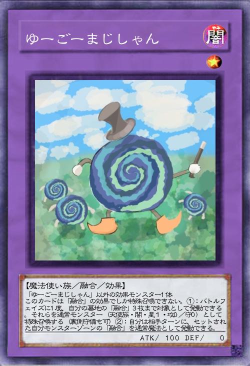 | 「ゆーごーまじしゃん」以外の効果モンスター1体 このカードは「融合」の効果でしか特殊召喚できない。①:バトルフェイズに1度、自分の墓地の「融合」3枚まで対象として発動できる。それらを通常モンスター(天使族・闇・星1・攻0/守0)として特殊召喚する(裏側守備も可)②:自分は相手ターンに、セットされた自分モンスターゾーンの「融合」を通常魔法として発動できる。 | |||
