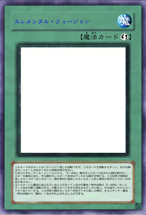 | このカード名のカードは1ターンに1度しか発動できず、このカードを発動するターン、自分は融合モンスターしかEXデッキから特殊召喚できない。 ①自分の手札・デッキ・フィールドから、「E・HERO」融合モンスターに記された融合素材モンスターを墓地に送り、その融合モンスター1体をEXデッキから融合召喚する。この効果で特殊召喚したモンスターはこのターン、融合素材に使用したモンスターと同じ属性の相手モンスターの効果を受けない。 ②このターンに墓地に送られていないこのカードと自分の墓地・除外状態の「E・HERO」モンスター2体を対象に発動できる。対象のカードを全て持ち主のデッキに戻し、その後デッキからカードを1枚ドローする。この効果で融合モンスターをEXデッキに戻した場合、さらにデッキ・墓地・除外状態から「融合」1枚を手札に加えることができる。 | |||