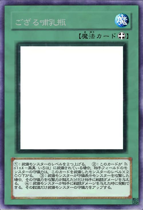 | ①:装備モンスターのレベルを2つ上げる。 ②:このカードが「holoX-風真 いろは」に装備されている場合、相手フィールドのモンスターの守備力は、このカードを装備したモンスターのレベル×200下がる。 ③:装備モンスターが守備表示モンスターを攻撃した場合、その守備力を攻撃力が超えた分だけ相手に戦闘ダメージを与える。 ④:装備モンスターが相手に戦闘ダメージを与えた時に発動できる。その数値だけ装備モンスターの守備力をアップする。 | |||