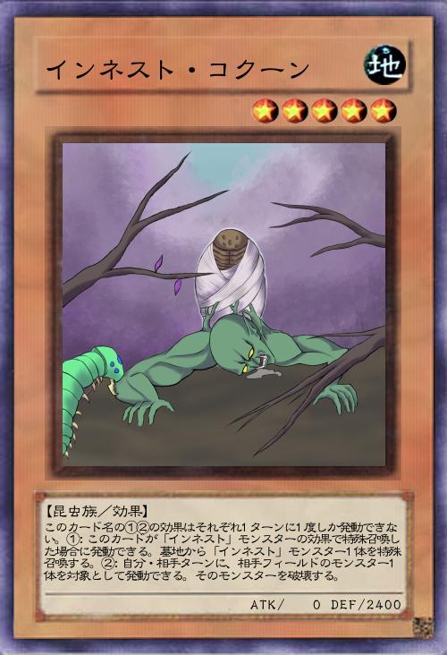 | このカード名の①②の効果はそれぞれ1ターンに1度しか発動できない。①:このカードが「インネスト」モンスターの効果で特殊召喚した場合に発動できる。墓地から「インネスト」モンスター1体を特殊召喚する。②:自分・相手ターンに、相手フィールドのモンスター1体を対象として発動できる。そのモンスターを破壊する。 | |||