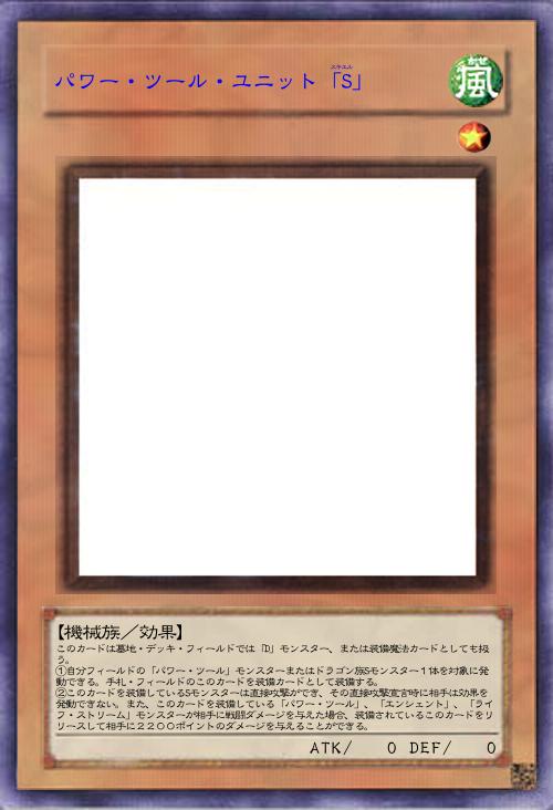 | このカードは墓地・デッキ・フィールドでは「D」モンスター、または装備魔法カードとしても扱う。 ①自分フィールドの「パワー・ツール」モンスターまたはドラゴン族Sモンスター1体を対象に発動できる。手札・フィールドのこのカードを装備カードとして装備する。 ②このカードを装備しているSモンスターは直接攻撃ができ、その直接攻撃宣言時に相手は効果を発動できない。また、このカードを装備している「パワー・ツール」、「エンシェント」、「ライフ・ストリーム」モンスターが相手に戦闘ダメージを与えた場合、装備されているこのカードをリリースして相手に2200ポイントのダメージを与えることができる。 | |||