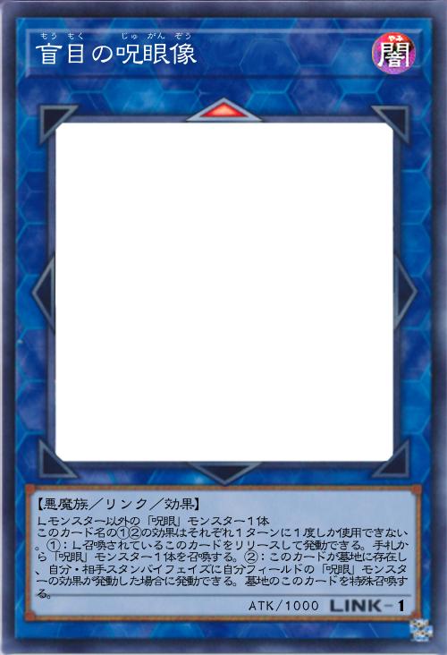 | Lモンスター以外の「呪眼」モンスター1体 このカード名の①②の効果はそれぞれ1ターンに1度しか使用できない。①:L召喚されているこのカードをリリースして発動できる。手札から「呪眼」モンスター1体を召喚する。②:このカードが墓地に存在し、自分・相手スタンバイフェイズに自分フィールドの「呪眼」モンスターの効果が発動した場合に発動できる。墓地のこのカードを特殊召喚する。 | |||