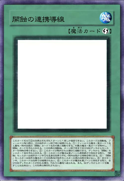 | このカード名の①②の効果はそれぞれ1ターンに1度しか使用できない。このカードは発動後、フィールドに残り続け、次の相手ターン終了時に破壊される。①:フィールドの魔法・罠カード1枚と墓地・除外状態の「開蝕」カード1枚を対象に発動できる。対象の魔法・罠カードを除外し、「開蝕」カードを手札に加える。この効果の発動後、ターン終了時まで自分はEXデッキからモンスターを特殊召喚できない。②:このカードが除外された場合に発動できる。デッキから「開蝕」モンスター1体を手札に加える。③:このカードが魔法&罠ゾーンに表側表示で存在する限り、「開蝕」モンスターは相手ターン中でも自身の効果で手札・除外状態から特殊召喚できる。④:「開蝕」モンスターは相手の魔法カードの効果及び相手モンスターの得た効果を受けない。⑤:自分ターン中、このカードは効果では破壊されない。⑥:このカードが魔法&罠ゾーンに存在する限り、自分のEXデッキにカードが加わる場合、代わりに墓地へ送られる。また、EXデッキからカードを離すことは出来ない。この効果は無効化されない。 | |||