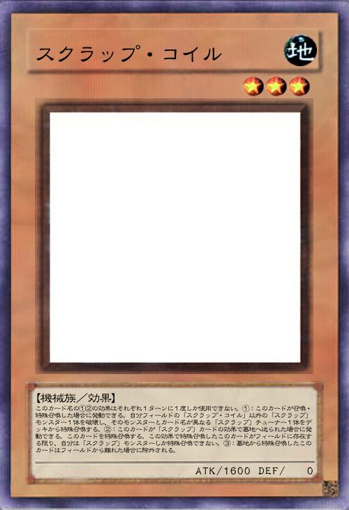 | このカード名の①②の効果はそれぞれ1ターンに1度しか使用できない。①:このカードが召喚・特殊召喚した場合に発動できる。自分フィールドの「スクラップ・コイル」以外の「スクラップ」モンスター1体を破壊し、そのモンスターとカード名が異なる「スクラップ」チューナー1体をデッキから特殊召喚する。②:このカードが「スクラップ」カードの効果で墓地へ送られた場合に発動できる。このカードを特殊召喚する。この効果で特殊召喚したこのカードがフィールドに存在する限り、自分は「スクラップ」モンスターしか特殊召喚できない。③:墓地から特殊召喚したこのカードはフィールドから離れた場合に除外される。 | |||