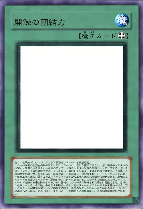 | 元々の攻撃力が1000のアンデッド族モンスターのみ装備可能。 このカード名の②③④の効果はそれぞれ1ターンに1度しか使用できない。①:装備モンスターの攻撃力・守備力は自分フィールドのアンデッド族モンスター×800ポイントアップする。②:自分メインフェイズに発動できる。デッキから「開蝕」モンスター1体を特殊召喚する。その後、この効果で特殊召喚したモンスターにこのカードを装備し、自分の手札・フィールドからモンスター1体を墓地へ送る。③:このカードがフィールドから墓地へ送られた場合に発動できる。墓地のこのカードを自分フィールドの「開蝕」モンスターに装備する。この効果で装備したこのカードはフィールドを離れる場合除外される。④:墓地のこのカードが除外された場合に発動できる。自分は1枚ドローする。その後、手札を1枚除外するか、自分フィールドのカード1枚を墓地へ送る。⑤:このカードが魔法&罠ゾーンに存在する限り、自分のEXデッキにカードが加わる場合、代わりに墓地へ送られる。また、EXデッキからカードを離すことは出来ない。この効果は無効化されない。 | |||
