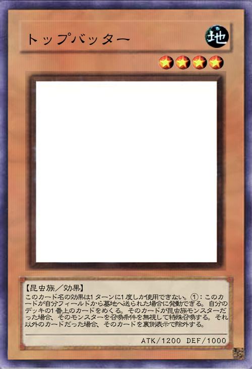| このカード名の効果は1ターンに1度しか使用できない。①:このカードが自分フィールドから墓地へ送られた場合に発動できる。自分のデッキの1番上のカードをめくる。そのカードが昆虫族モンスターだった場合、そのモンスターを召喚条件を無視して特殊召喚する。それ以外のカードだった場合、そのカードを裏側表示で除外する。 | |||