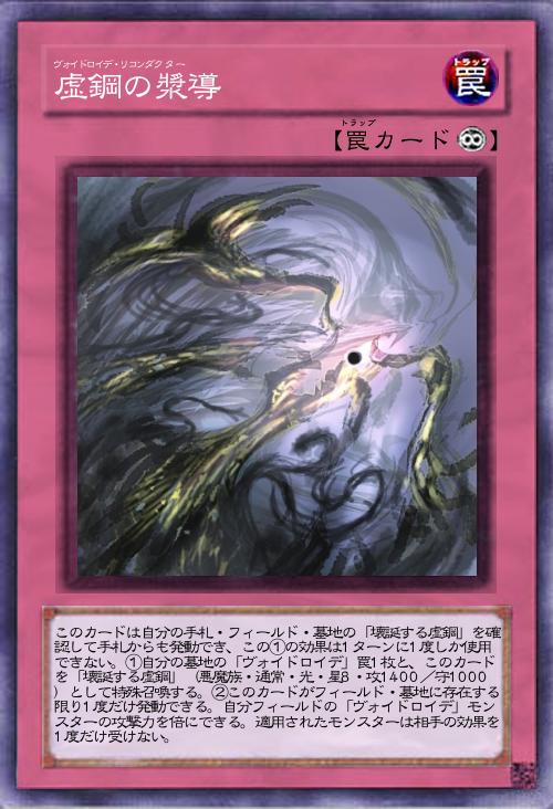 | このカードは自分の手札・フィールド・墓地の「壊誕する虚鋼」を確認して手札からも発動でき、この①の効果は1ターンに1度しか使用できない。①自分の墓地の「ヴォイドロイデ」罠1枚と、このカードを「壊誕する虚鋼」(悪魔族・通常・光・星8・攻1400/守1000)として特殊召喚する。②このカードがフィールド・墓地に存在する限り1度だけ発動できる。自分フィールドの「ヴォイドロイデ」モンスターの攻撃力を倍にできる。適用されたモンスターは相手の効果を1度だけ受けない。 | |||