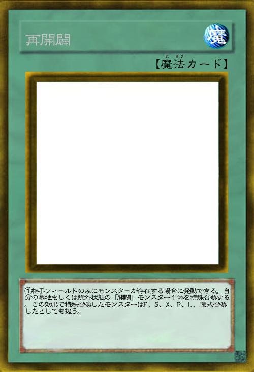 | ①相手フィールドのみにモンスターが存在する場合に発動できる。自分の墓地もしくは除外状態の「開闢」モンスター1体を特殊召喚する。この効果で特殊召喚したモンスターはF、S、X、P、L、儀式召喚したとしても扱う。 | |||