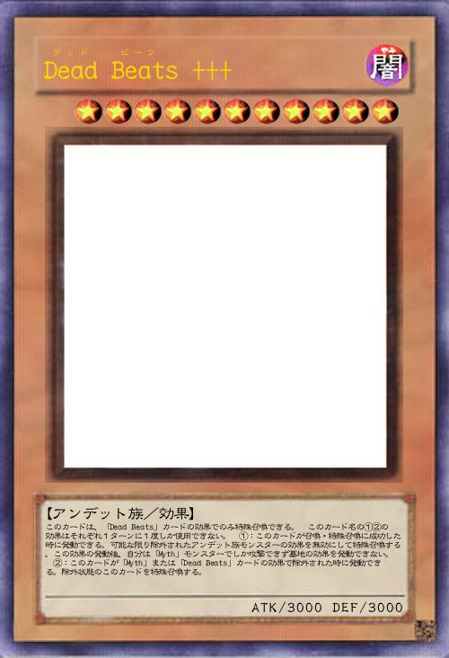 | このカードは、「Dead Beats」カードの効果でのみ特殊召喚できる。 このカード名の①②の効果はそれぞれ1ターンに1度しか使用できない。 ①:このカードが召喚・特殊召喚に成功した時に発動できる。可能な限り除外されたアンデット族モンスターの効果を無効にして特殊召喚する。この効果の発動後、自分は「Myth」モンスターでしか攻撃できず墓地の効果を発動できない。 ②:このカードが「Myth」または「Dead Beats」カードの効果で除外された時に発動できる。除外状態のこのカードを特殊召喚する。 | |||