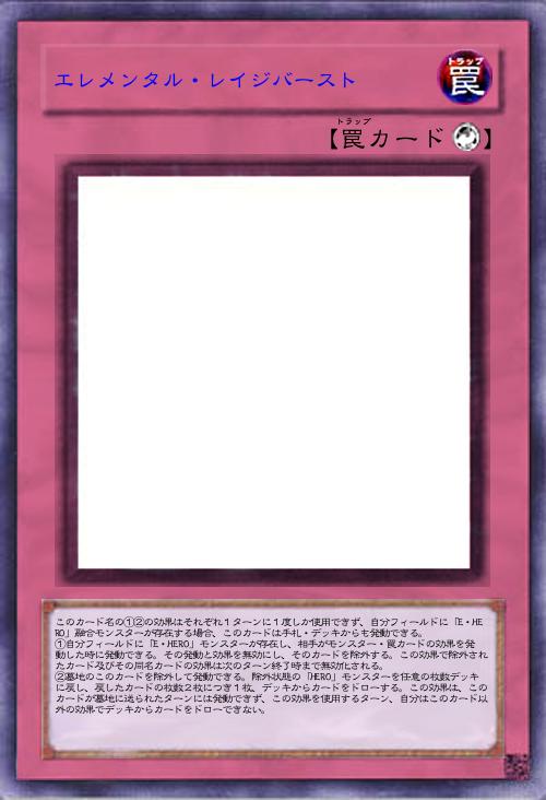 | このカード名の①②の効果はそれぞれ1ターンに1度しか使用できず、自分フィールドに「E・HERO」融合モンスターが存在する場合、このカードは手札・デッキからも発動できる。 ①自分フィールドに「E・HERO」モンスターが存在し、相手がモンスター・罠カードの効果を発動した時に発動できる。その発動と効果を無効にし、そのカードを除外する。この効果で除外されたカード及びその同名カードの効果は次のターン終了時まで無効化される。 ②墓地のこのカードを除外して発動できる。除外状態の「HERO」モンスターを任意の枚数デッキに戻し、戻したカードの枚数2枚につき1枚、デッキからカードをドローする。この効果は、このカードが墓地に送られたターンには発動できず、この効果を使用するターン、自分はこのカード以外の効果でデッキからカードをドローできない。 | |||