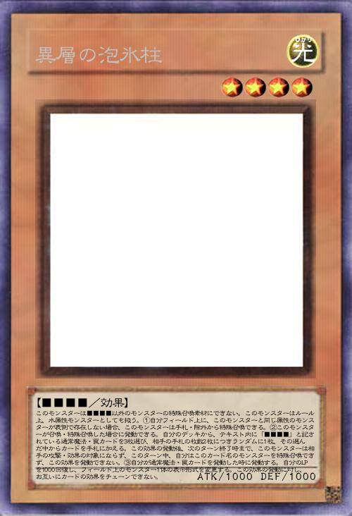 | このモンスターは■■■■以外のモンスターの特殊召喚素材にできない。このモンスターはルール上、水属性モンスターとしても扱う。①自分フィールド上に、このモンスターと同じ属性のモンスターが表側で存在しない場合、このモンスターは手札・除外から特殊召喚できる。②このモンスターが召喚・特殊召喚した場合に発動できる。自分のデッキから、テキスト内に「■■■■」と記されている通常魔法・罠カードを3枚選び、相手の手札の枚数2枚につきランダムに1枚、その選んだ中からカードを手札に加える。この効果の発動後、次のターン終了時まで、このモンスターは相手の攻撃・効果の対象にならず、このターン中、自分はこのカード名のモンスターを特殊召喚できず、この効果を発動できない。③自分が通常魔法・罠カードを発動した時に発動する。自分のLPを1000回復し、フィールド上のモンスター1体の表示形式を変更する。この効果の発動に対し、お互いにカードの効果をチェーンできない。 | |||