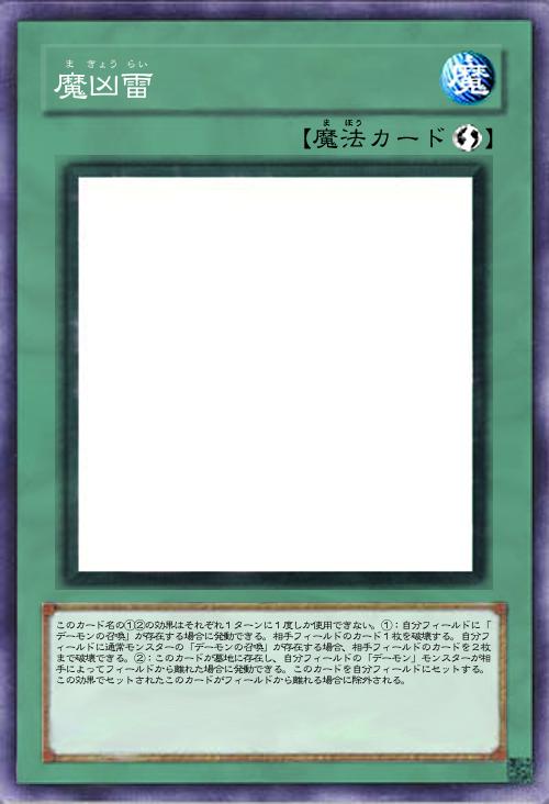 | このカード名の①②の効果はそれぞれ1ターンに1度しか使用できない。①:自分フィールドに「デーモンの召喚」が存在する場合に発動できる。相手フィールドのカード1枚を破壊する。自分フィールドに通常モンスターの「デーモンの召喚」が存在する場合、相手フィールドのカードを2枚まで破壊できる。②:このカードが墓地に存在し、自分フィールドの「デーモン」モンスターが相手によってフィールドから離れた場合に発動できる。このカードを自分フィールドにセットする。この効果でセットされたこのカードがフィールドから離れる場合に除外される。 | |||