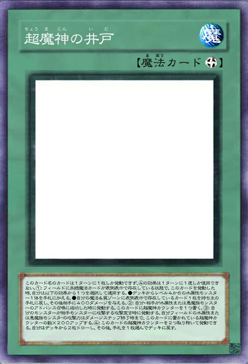 | このカード名のカードは1ターンに1枚しか発動できず、④の効果は1ターンに1度しか使用できない。①:フィールドに永続魔法カードが表側表示で存在している状態で、このカードを発動した時、自分は以下の効果から1つを選択して適用する。●デッキからレベル4か6の水属性モンスター1体を手札に加える。●自分の魔法&罠ゾーンに表側表示で存在しているカード1枚を持ち主の手札に戻し、その後相手に400ダメージを与える。②:自分・相手が水属性または悪魔族モンスターのアドバンス召喚に成功した時に発動する。このカードに超魔神カウンターを1つ置く。③:自分のモンスターが相手モンスターに攻撃する攻撃宣言時に発動する。自分フィールドの水属性または悪魔族モンスターの攻撃力はダメージステップ終了時まで、このカードに置かれている超魔神カウンターの数×200アップする。④:このカードの超魔神カウンターを2つ取り除いて発動できる。自分はデッキから2枚ドローし、その後、手札を1枚選んでデッキに戻す。 | |||